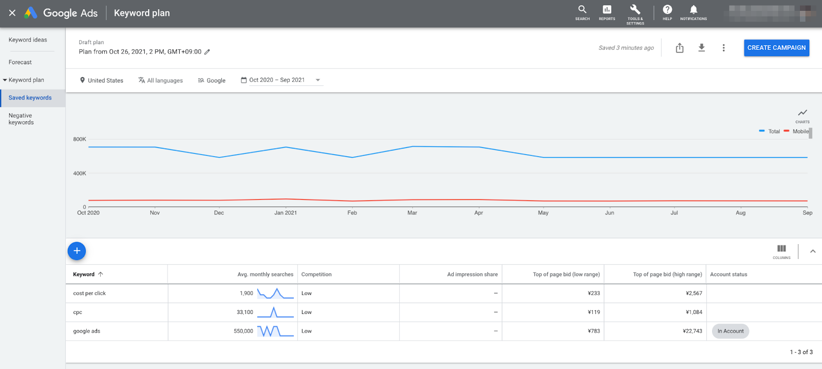 You’ll now see the average monthly searches, competition, ad impression share, and high & low top of page bid range for the keywords you selected.